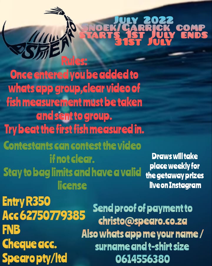 At least there is something to look forward to this July when the Spearo Garrick/Snoek compo is on for the whole month! Loads of great prizes and some lucky draws too even if you do not win! Details in the two flyers I have put below.